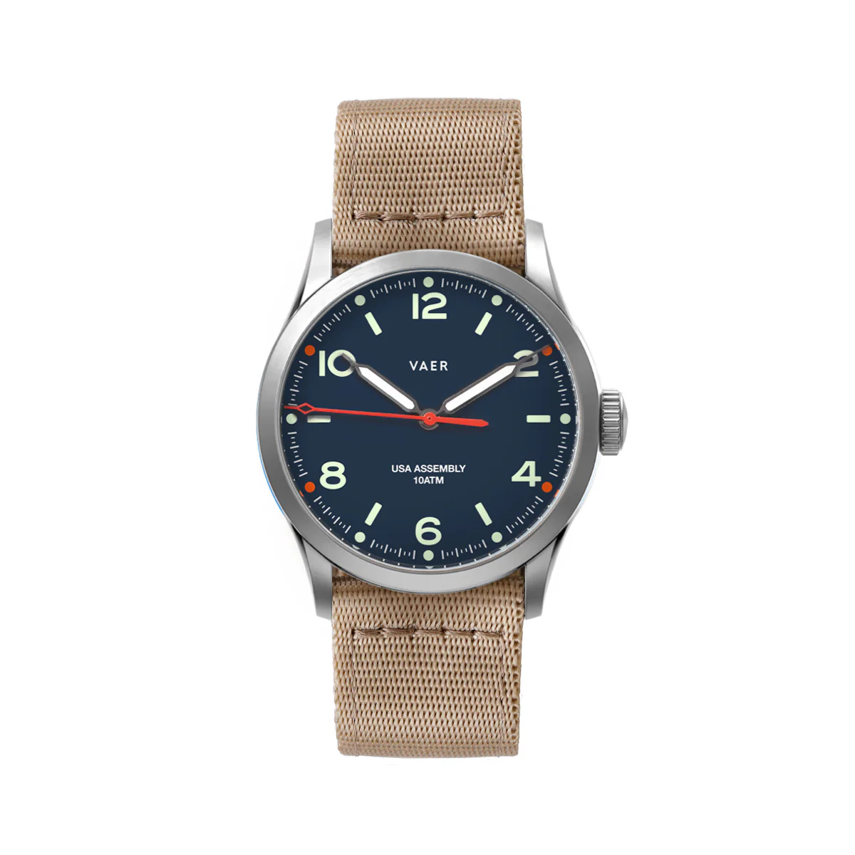 SUMMARY: This is the new solar-powered version of our popular Design Navy field watch, which was first introduced into the Vaer lineup in 2019. Why have we transitioned to solar? In our opinion, solar movements provide the best of both worlds - perpetual timekeeping with incredible accuracy. Six hours of sunlight will provide six months of power reserve, and the watch can run off any light source (even candlelight). In terms of aesthetics, the C3 Design Navy stands out in the Vaer line-up thanks to its excellent balance between Bauhaus minimalism, and rugged outdoor functionality. As a C3 model, this watch is part of our all-time bestselling collection, distinguished by its ocean-ready functionality, low-profile case design, ultra-accurate solar quartz movement, and full USA assembly.
